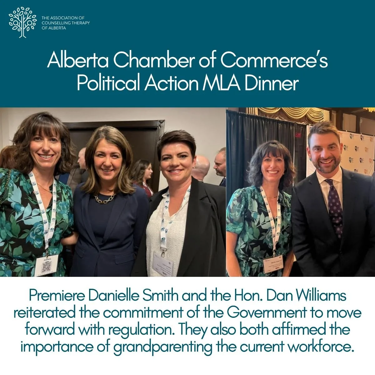 Both Premiere Smith and Minister Williams reiterated the commitment of the Government to move forward with regulation. They also both affirmed the importance of grandparenting the current workforce. The impression given by both these interactions was that the government remains highly motivated to proclaim Counselling Therapists within CAP and will support the collaborative work that must be done by ACTA, CAP and Alberta Health to ensure it is completed in 2025.