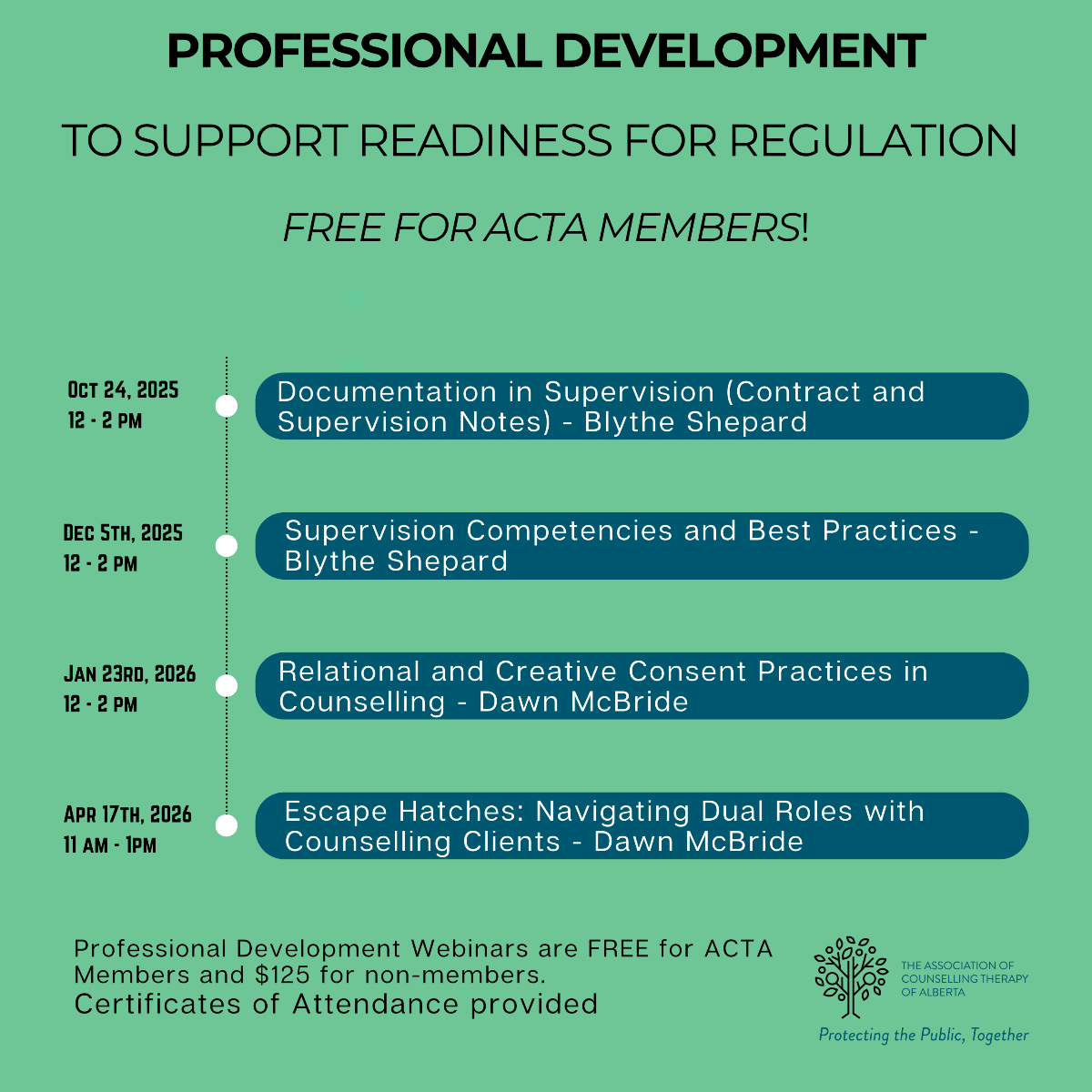 We have been assured that there will soon be further collaborative meetings involving ACTA to start getting the work underway within expected timelines. Although the exact updated timelines have yet to be clarified, it is clear the government recognizes the need for counselling therapists to be regulated to support mental health initiatives throughout Alberta.