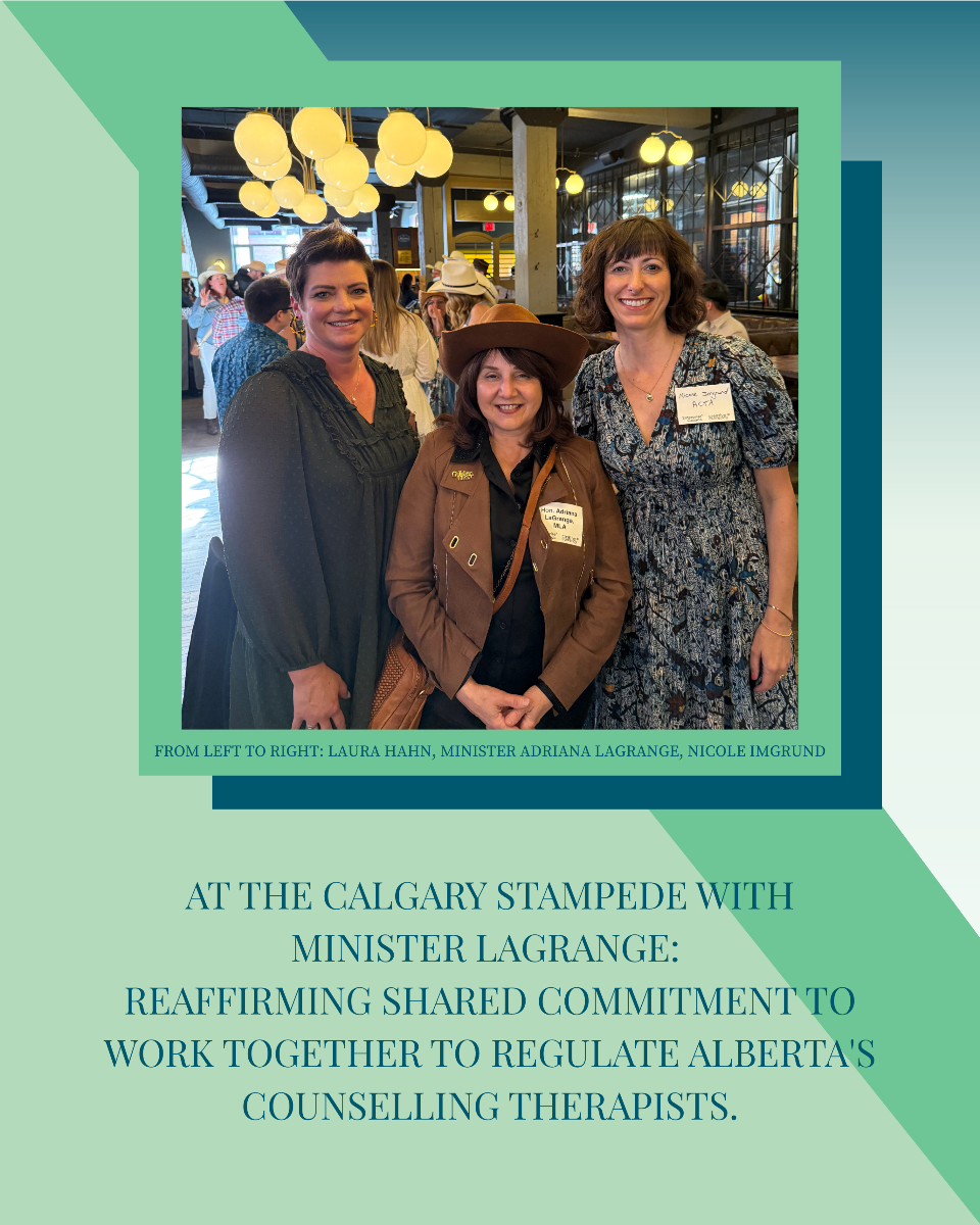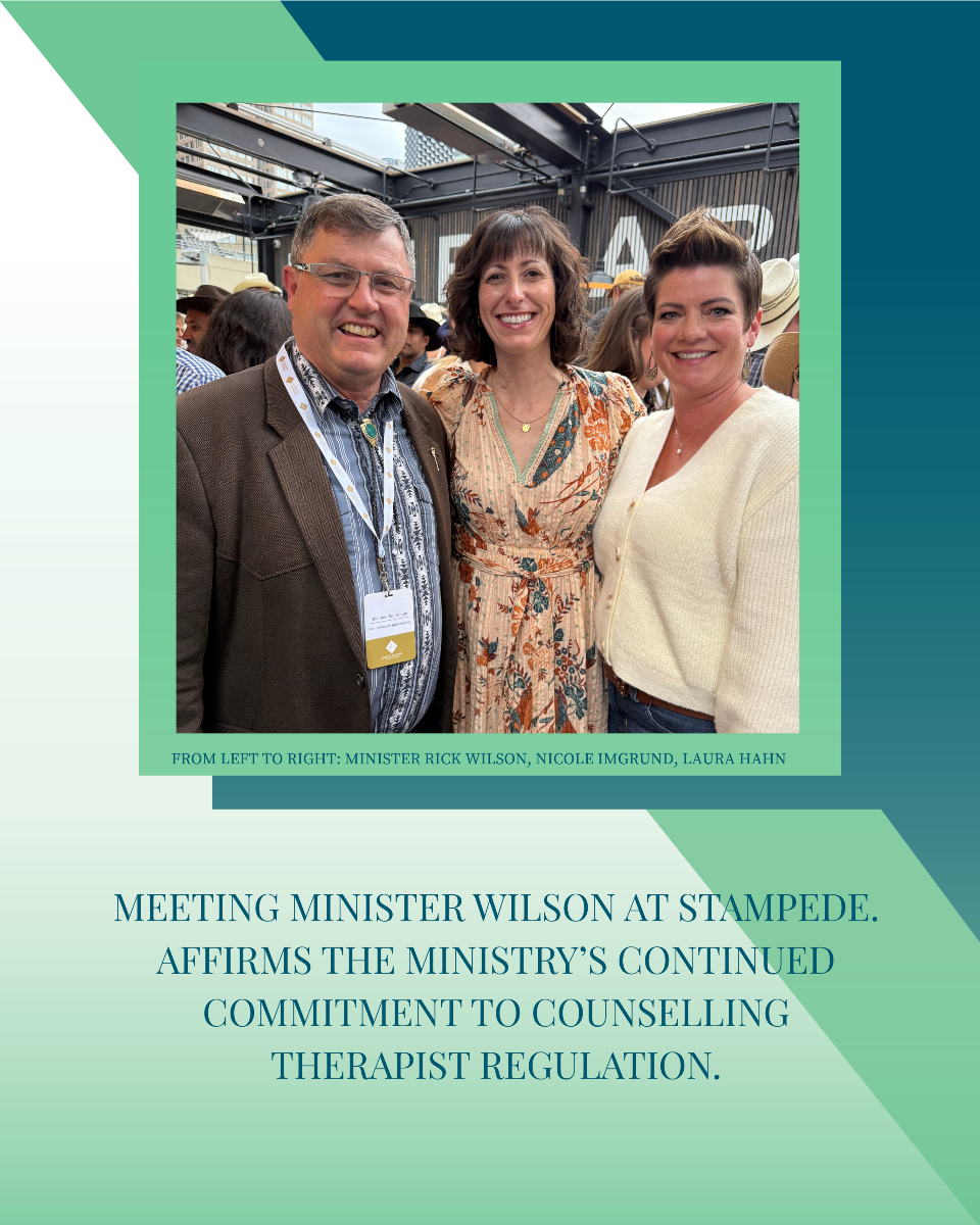 Over the summer, ACTA leaders engaged directly with political leaders at the Calgary Stampede and other events. We had a series of valuable discussions with Minister Adriana LaGrange, Minister Rick Wilson, and Deputy Minister Evan Romanow. Each reaffirmed the urgency of moving Counselling Therapist regulation forward and emphasized that public protection remains a priority. These connections are essential in keeping regulation front of mind with decision-makers, and ACTA continues to be recognized as a key partner in completing regulation.